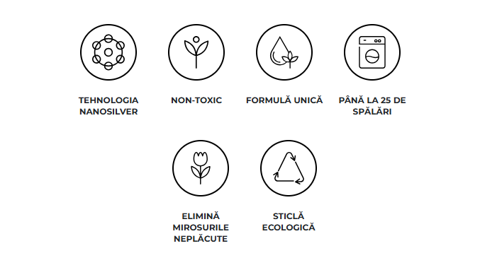 Nanoparticule de argint – acțiune antibacteriană și de neutralizare a mirosurilor.