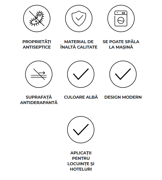 Produsul este îmbogățit cu nanoparticule de argint, care îi conferă proprietăți antibacteriene, antivirale și antifungice, menținând covorul igienic și sigur în orice moment. Suprafața antiderapantă previne alunecarea, iar designul modern și universal îl face potrivit atât pentru locuințe, cât și pentru spații hoteliere.
